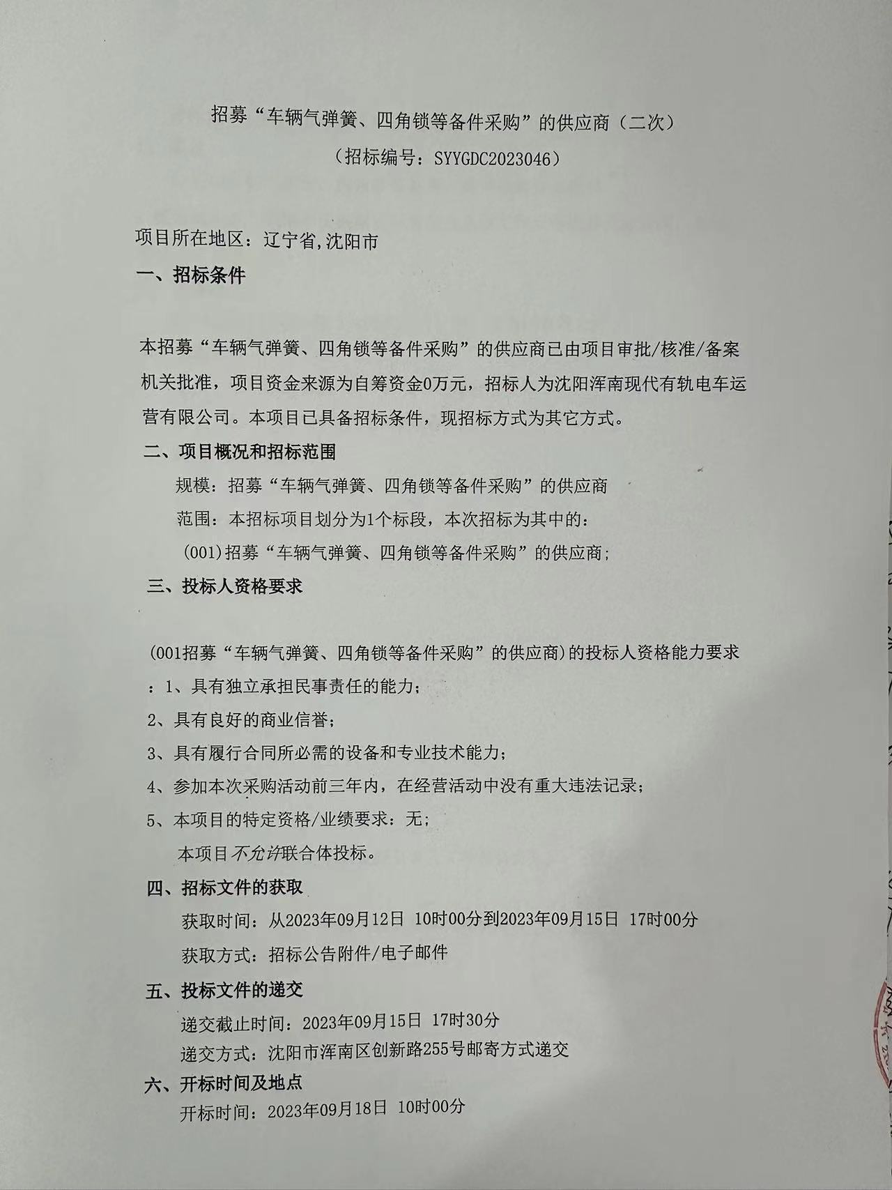 招采公告-招募“车辆气弹簧、四角锁等备件采购”的供应商(二次)