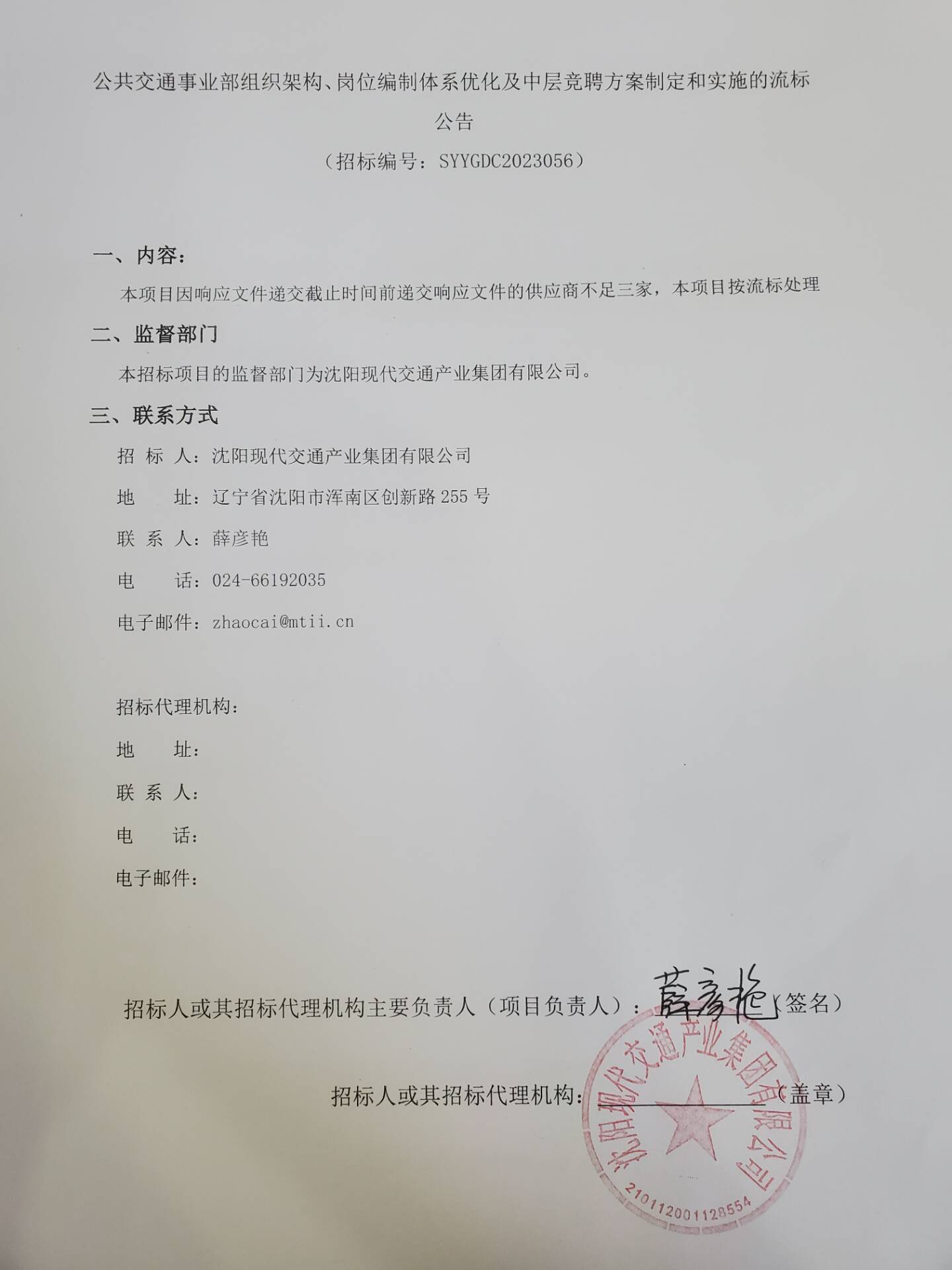 公共交通事业部组织架构、岗位编制体系优化及中层竞聘方案制定和实施的流标公告