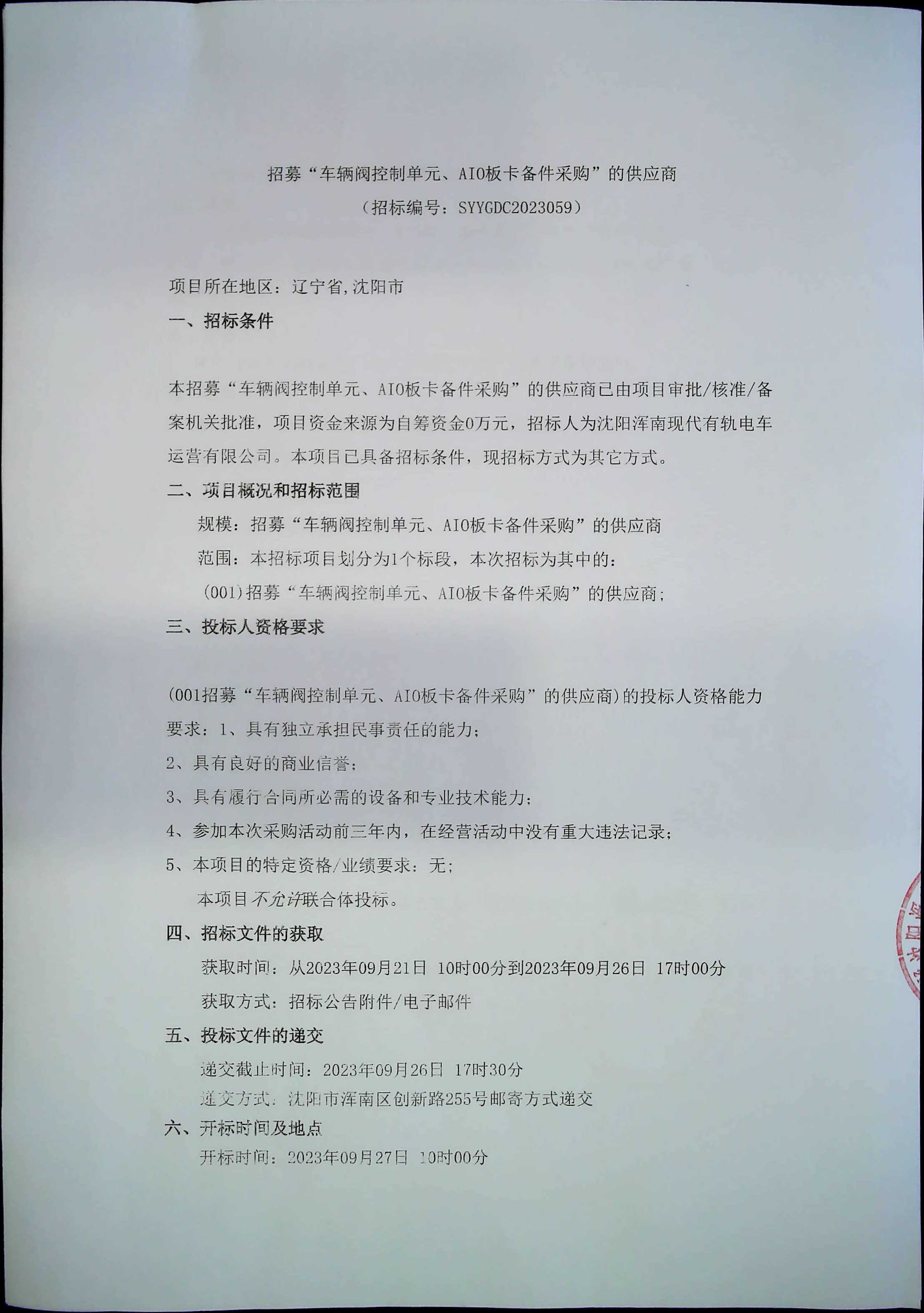 招采公告-招募“车辆阀控制单元、AIO板卡备件采购”的供应商