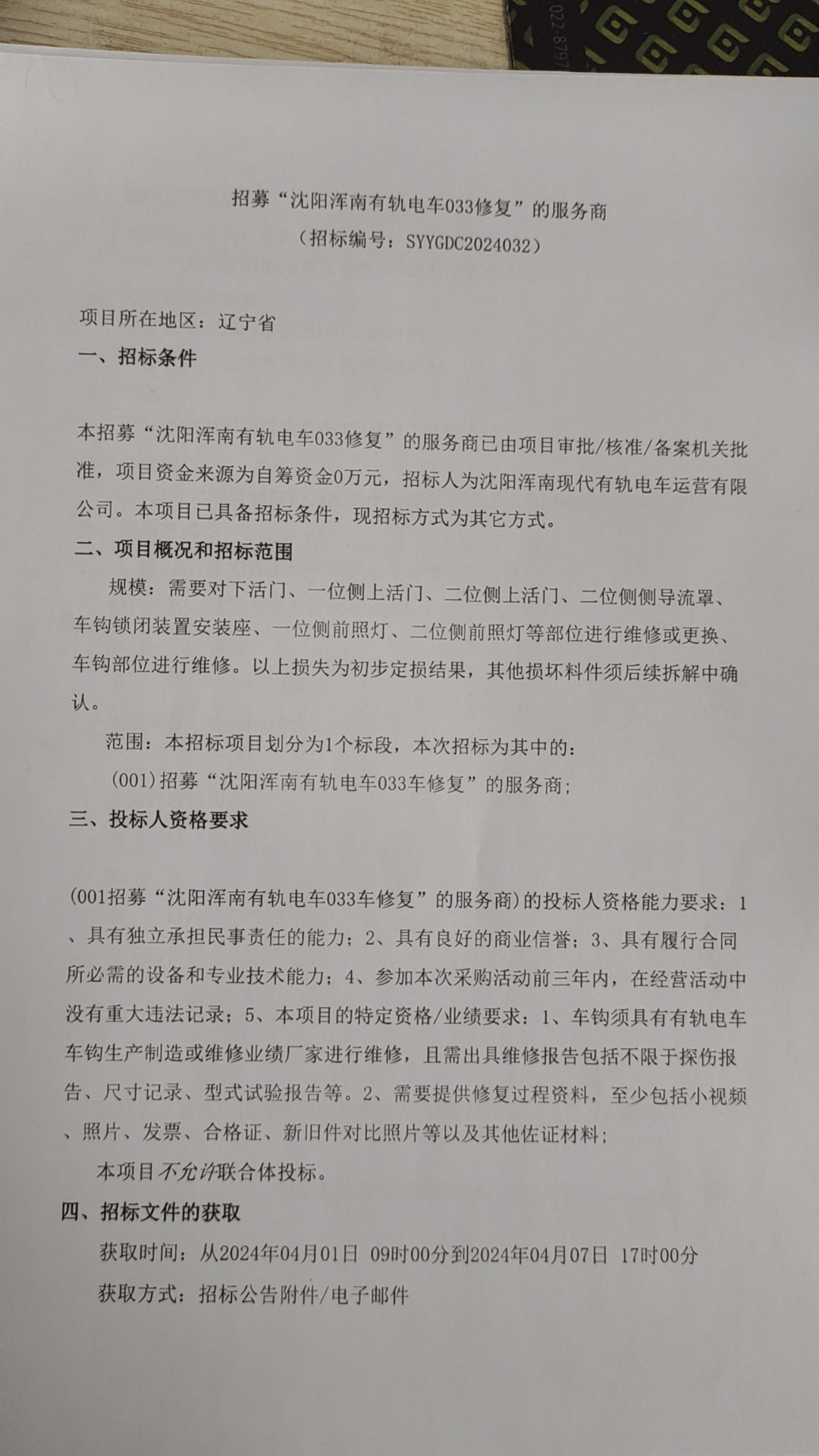 招采公告-招募“沈阳浑南有轨电车033修复”的服务商