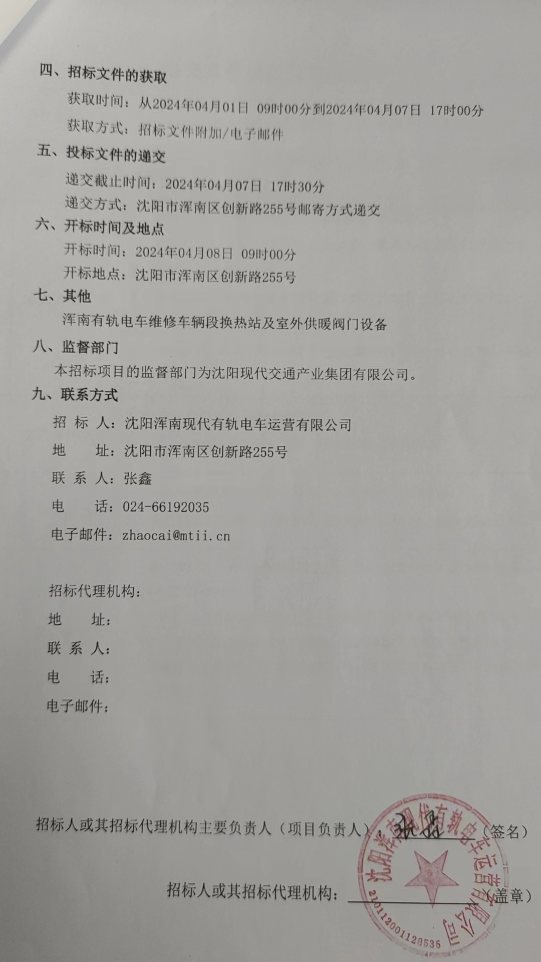 招采公告-招募“沈阳浑南有轨电车维修车辆段换热站及室外供暖阀门设备”的服务商