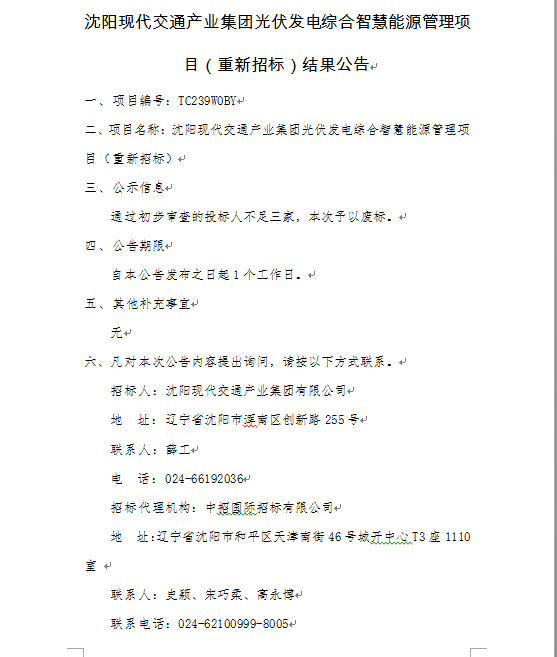 沈阳现代交通产业集团光伏发电综合智慧能源管理项目(重新招标)的流标公告