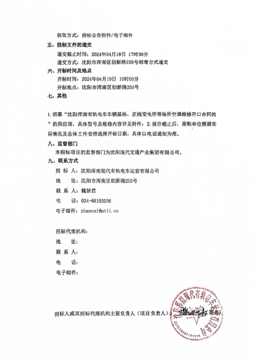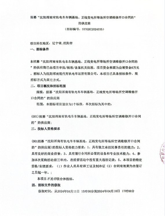 招采公告-招募“沈阳浑南有轨电车车辆基地、正线变电所等场所空调维修开口合同的”的供应商