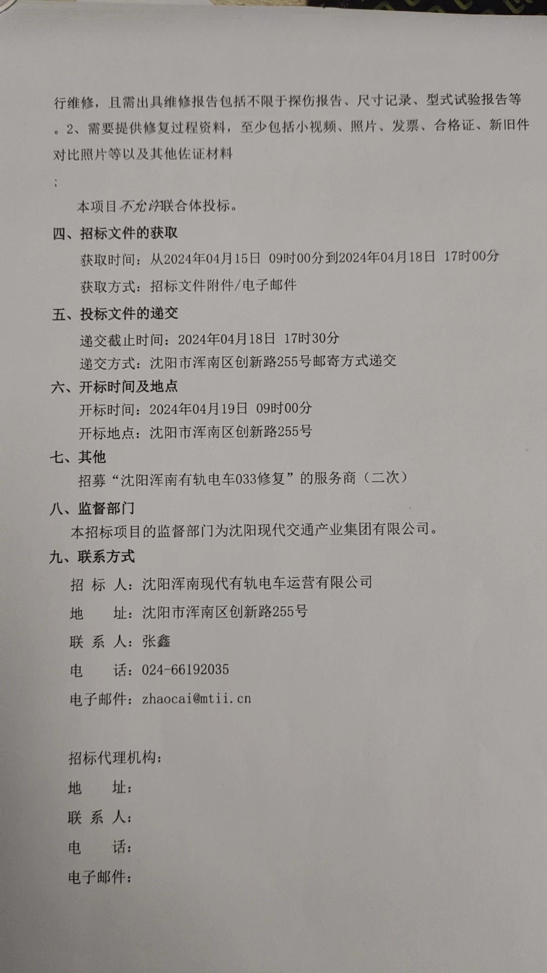 招采公告-招募“沈阳浑南有轨电车033修复”的服务商(二次)