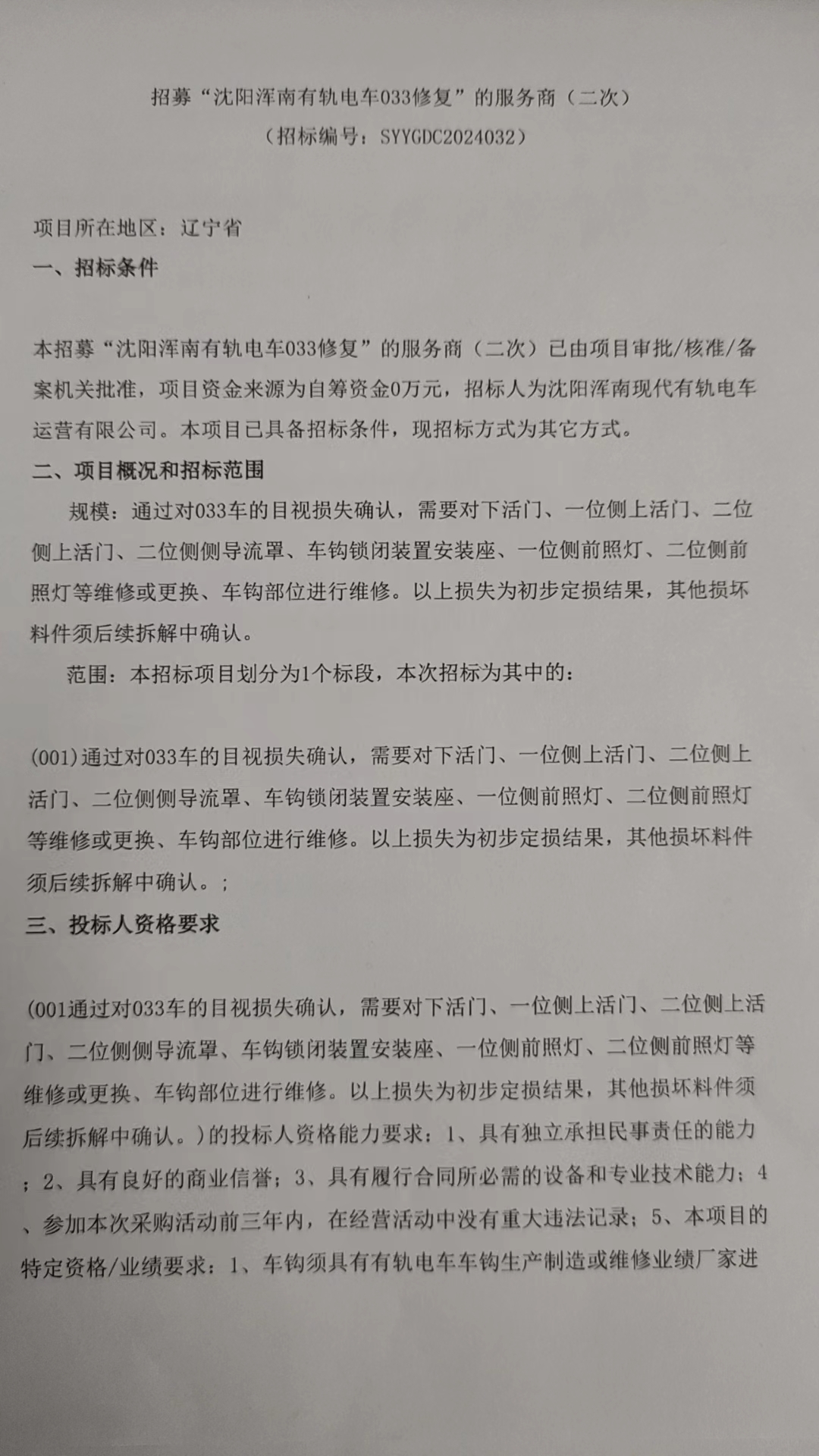 招募“沈阳浑南有轨电车033修复”的服务商(二次)
