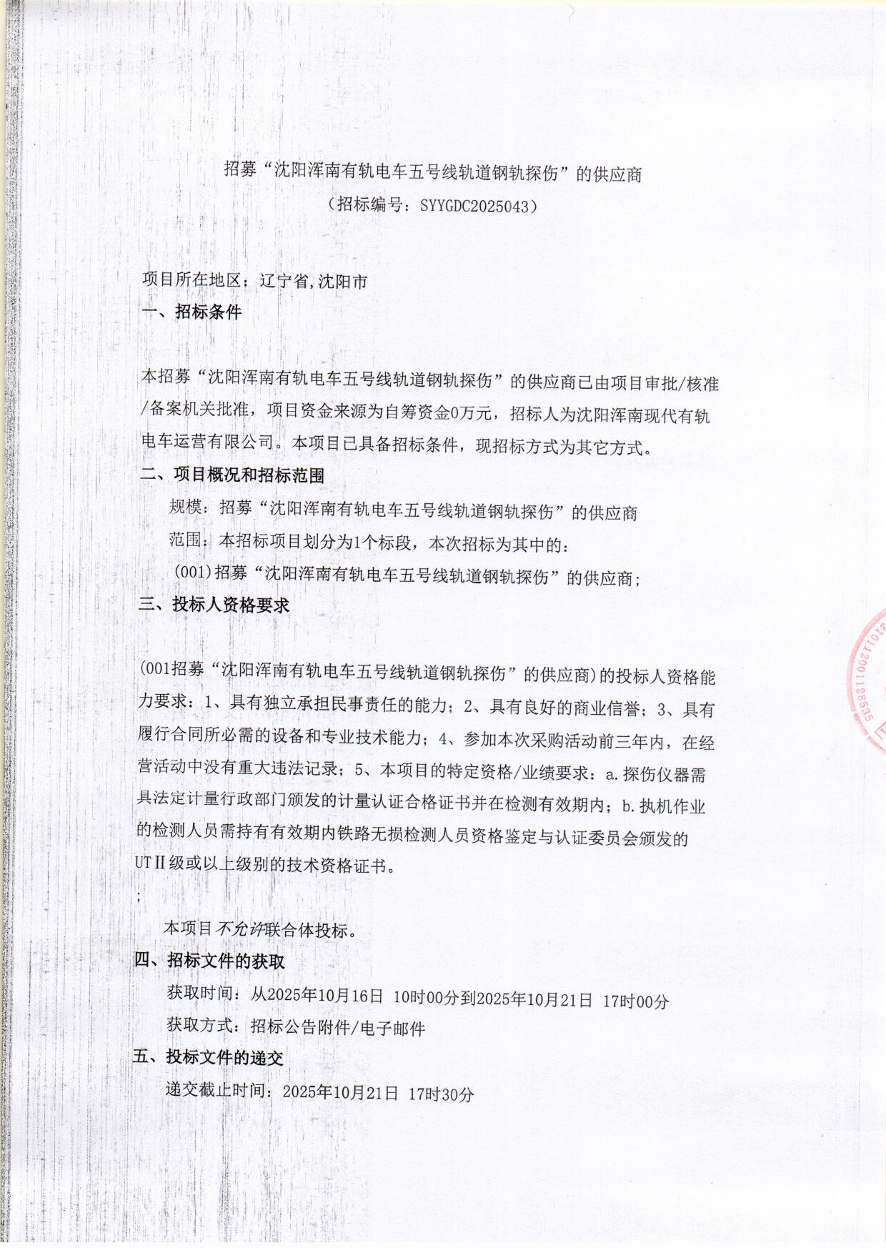 招采公告-招募“沈阳浑南有轨电车五号线轨道钢轨探伤”的供应商